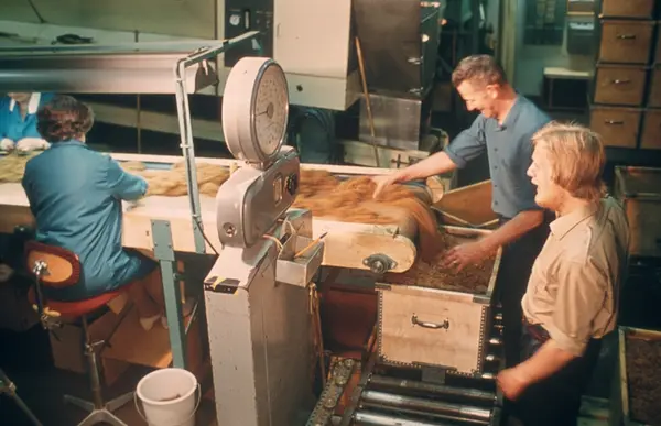 Fabrikkinteriør. H. Petterøe tobakksfabrikk, pakkeavdeling, røyketobakk. Bildeserie i forbindelse med presentasjon av Petterøes tobakk i 1970.