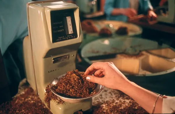 Fabrikkinteriør. H. Petterøe tobakksfabrikk, pakkeavdeling, røyketobakk. Bildeserie i forbindelse med presentasjon av Petterøes tobakk i 1970.