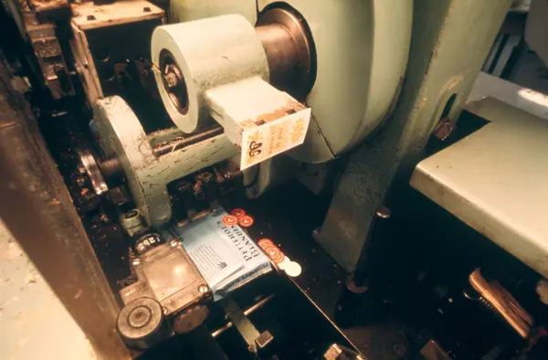 Fabrikkinteriør. H. Petterøe tobakksfabrikk, pakkeavdeling, røyketobakk. Avgiftsmerke limes på pakkene. Billedserie i forbindelse med presentasjon av Petterøes tobakk i 1970.