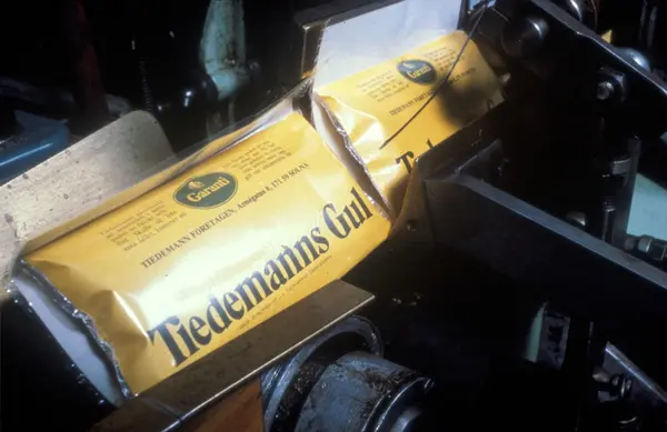 Fabrikkinteriør. Pakkeavdeling røyketobakk. Reklamefoto av produksjon av Tiedemanns gul mix i fabrikk. Billedserie til Tiedemanns Gul Mix eksportprogram fra 1980.