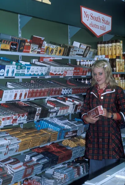 Butikkinteriør. Kvinnelig butikkansatt foran hylle med tobakk i butikk. Trosterud super. Reklame for South State sigaretter.