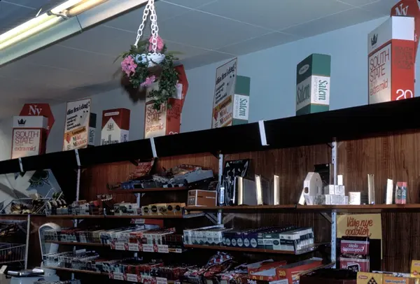 Butikkinteriør. Hylle med tobakk i butikk. Magnussen, Tveita. Reklame for South State sigaretter.
