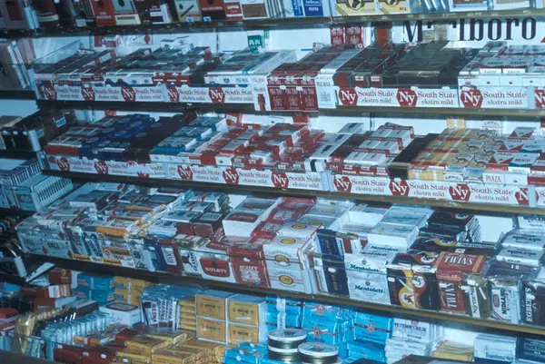 Butikkinteriør. Hylle med tobakk i butikk. CC, Majorstua. Reklame for South State sigaretter.