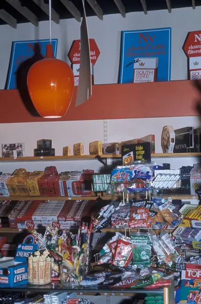 Butikkinteriør. Hylle med tobakk i butikk. Favorit Tobakk. Reklame for South State sigaretter.