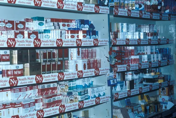 Butikkinteriør. Hylle med tobakk i butikk. Lysdahl. Reklame for South State sigaretter.