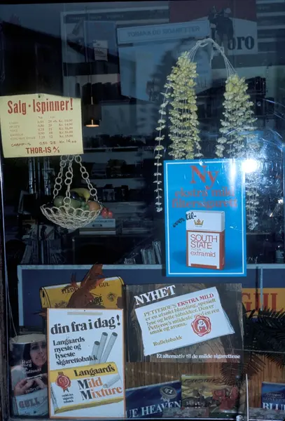 Butikkinteriør. Egeland frukt og tobakk. Reklame for South State sigaretter.