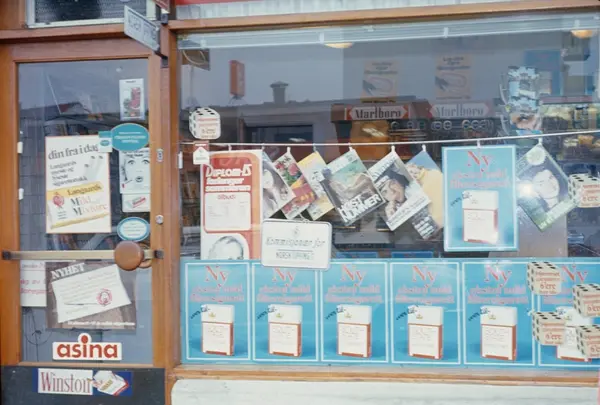 Egeland frukt og tobakk. Reklame for South State sigaretter i vinduet.