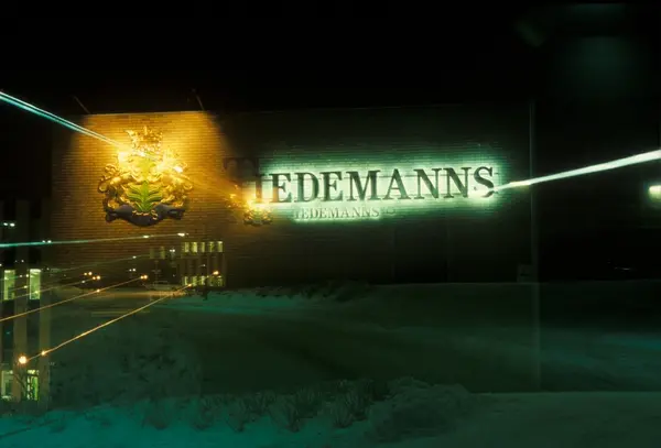 Tiedemanns Tobaksfabrik med lysende reklameskilt. Fra foredrag om Tiedemanns markedspartnerstrategi 1985.