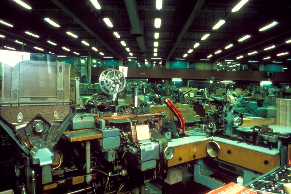 Fabrikkinteriør. Sigarettpakkemaskin til South State plain, i bruk fra 1960-2005. Produksjon av tobakk hos Tiedemanns Tobaksfabrik.