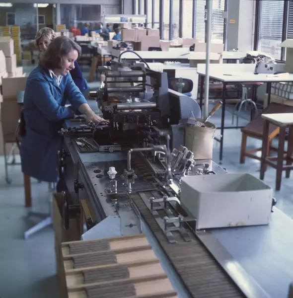 Fabrikkinteriør. Sigarpakkeavdeling. Produksjon av tobakk hos Tiedemanns Tobaksfabrik.
