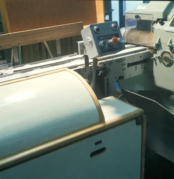 Fabrikkinteriør. Sigarettmaskin. Produksjon av tobakk hos Tiedemanns Tobaksfabrik.