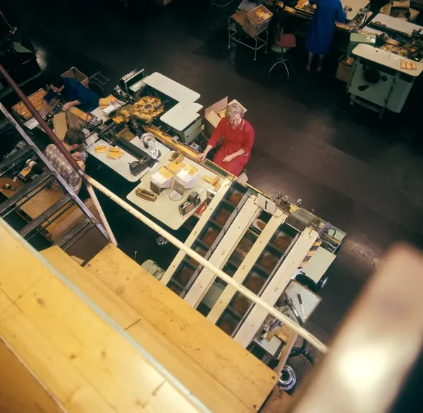 Fabrikkinteriør. Røyketobakk tilberedning pakkemaskin. Produksjon av tobakk hos Tiedemanns Tobaksfabrik.