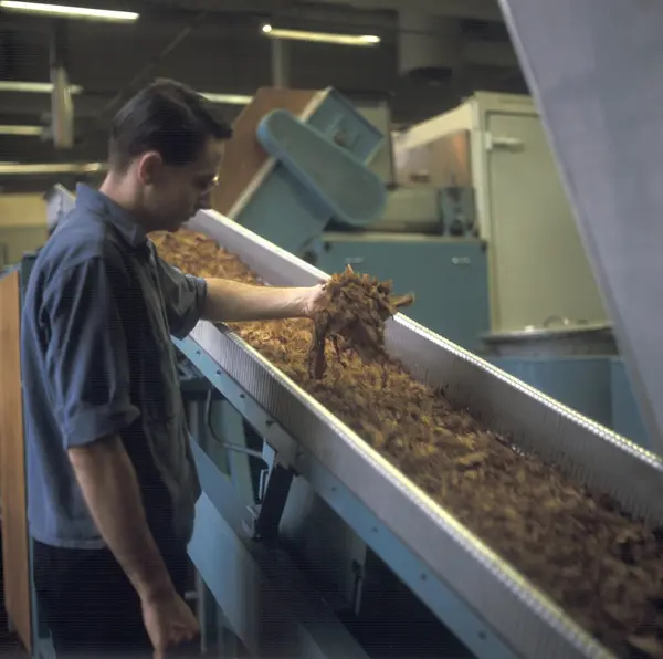 Fabrikkinteriør. Tilberedning røyketobakk. Produksjon av tobakk hos Tiedemanns Tobaksfabrik.