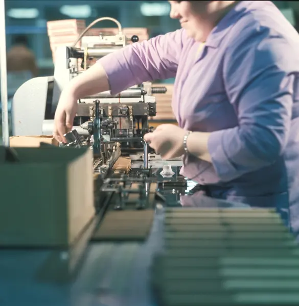 Fabrikkinteriør. Sigaravdeling. Setter på magebelte og cellofanerer. Produksjon av tobakk hos Tiedemanns Tobaksfabrik.
