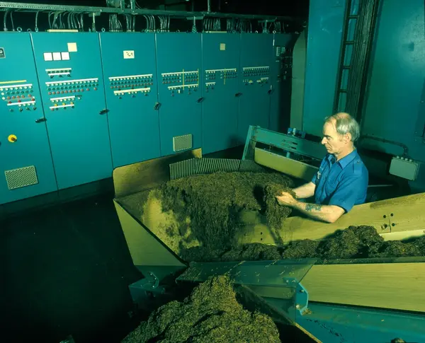Fabrikkinteriør. Rulletobakkproduksjon. Tobakken etter skjæring, før tørking/kjøling. Produksjon av tobakk ved Tiedemanns Tobaksfabrik.