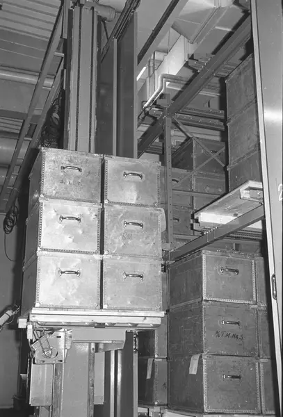 Fabrikkinteriør. Snittobakklager der tobakken holdes i minimum 24 timer etter tilbereding før lagring. Produksjon av tobakk hos Tiedemanns Tobaksfabrik i 1969