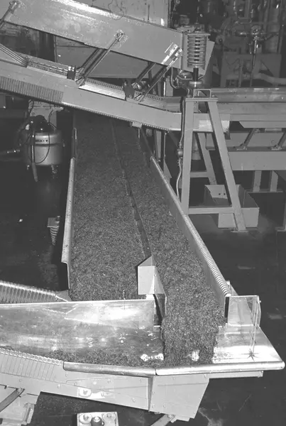 Fabrikkinteriør. Vibrasjonstransportører der tobakken er på vei til kjøla. Produksjon av tobakk hos Tiedemanns Tobaksfabrik i 1969