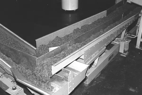 Fabrikkinteriør. Vibrasjonstransportører der tobakken er på vei til kjøla. Produksjon av tobakk hos Tiedemanns Tobaksfabrik i 1969