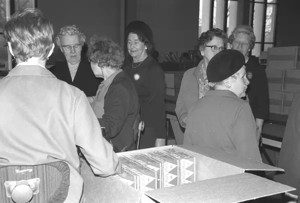 Fabrikkinteriør. Pakkeavdeling sigaretter. Gruppe med mennesker på omvisning i fabrikk i 1969. Produksjon av tobakk hos Tiedemanns Tobaksfabrik.