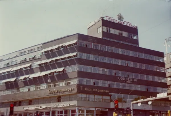 Skilt med reklame for Tiedemann og Teddy sigaretter på tak ved Nationaltheatret i Oslo.