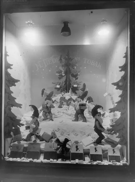 Vindusutstilling hos Sol på Drammensveien 8 (idag Henrik Ibsens gate 28) fra 1927 med julepynt og julereklame fra Tiedemann.