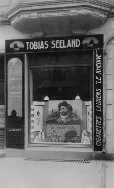 Vindusutstilling hos Tobias Seeland med reklame for Sultan sigaretter.