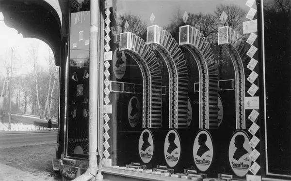 Vindusutstilling hos Sol på Drammensveien 8 (idag Henrik Ibsens gate 28) fra våren 1929 med reklame for Sorte Mand sigarer.