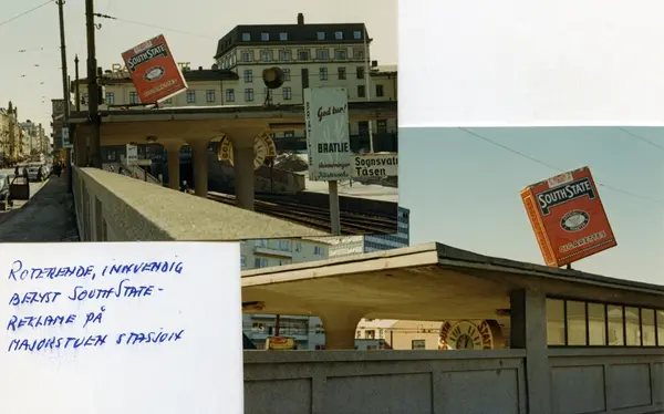Fotomontasje med to bilder på skilt med reklame for South State sigaretter på Majorstuen stasjon i Oslo.