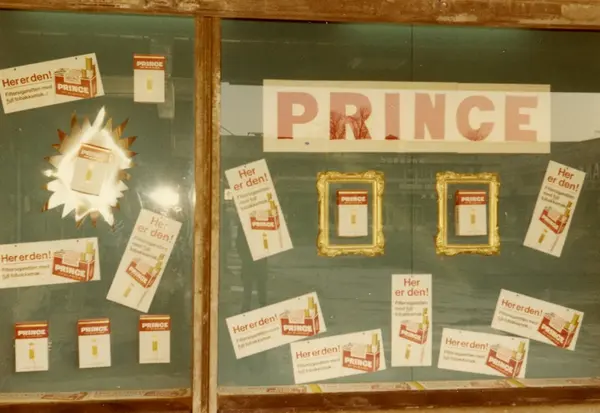 Vindusutstilling med reklame for Prince sigaretter hos Manglerud Super i Oslo.