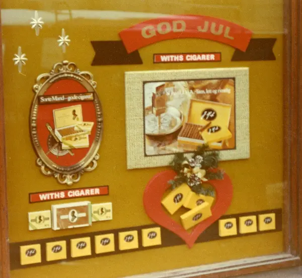 Vindusutstilling med reklame for Sorte Mand sigarer hos Majoren Tobakk.
