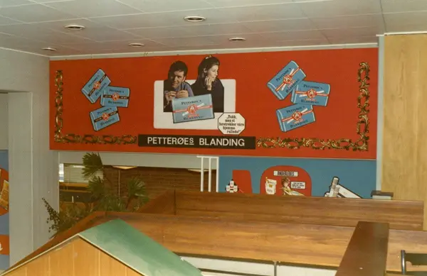 Reklame for Petterøes rulletobakk hos Manglerud Super.