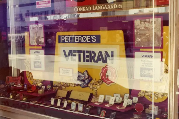 Vindusutstilling med reklame for Petterøes Veteran rulletobakk hos tobakksbutikk på Storgata i Oslo.