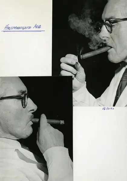 Fotomontasje, mann som røyker sigar, tatt på Tiedemanns fabrikk på Hausmanns gate i 1956.