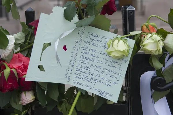 "Sorg i det offentlige rom". Blomster og kort med hilsen utenfor Stortinget.