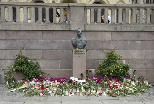 "Sorg i det offentlige rom". Blomster, lys og hilsener ved Christian Michelsen-statuen utenfor Stortinget.