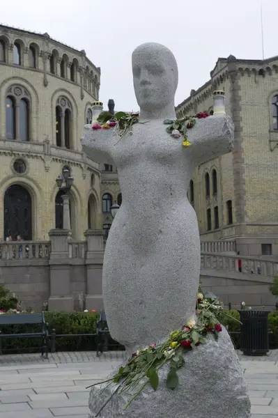 "Sorg i det offentlige rom". Blomster og lys ved statue utenfor Stortinget.