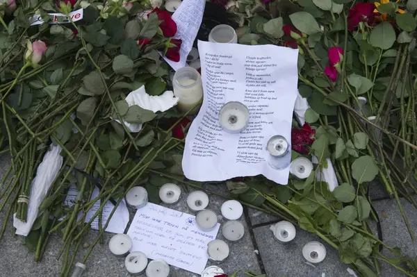"Sorg i det offentlige rom". Blomster, hilsener og lys på fortau til Karl Johans gate.
