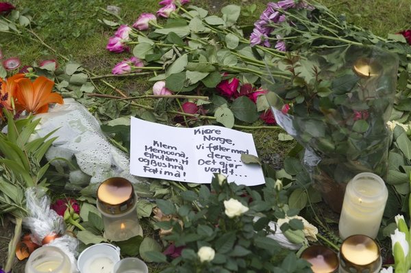 "Sorg i det offentlige rom". Blomster, lys og hilsener ved Oslo Domkirke.