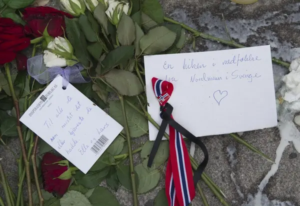 "Sorg i det offentlige rom". Blomster og hilsener i Akersgata.