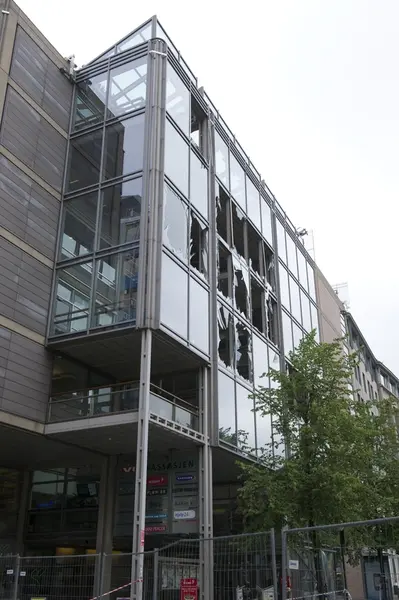 "Sorg i det offentlige rom". VG-bygget i Akersgata etter bombeeksplosjonen 22. juli 2011. Knuste vinduer på byggets fasade.