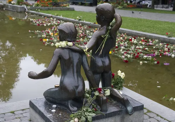 "Sorg i det offentlige rom". Blomster ved fontenen i "Spikersuppa", Eidsvolls plass. En skulptur er dekorert med roser.