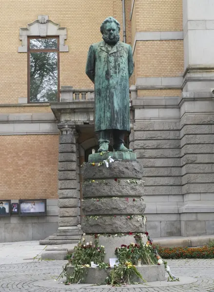 "Sorg i det offentlige rom". Stephan Sindings statue av Henrik Ibsen foran Nationaltheatrets hovedinngang dekorert med blomster, lys og hilsener.
