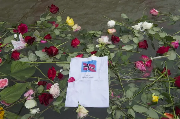 "Sorg i det offentlige rom". Blomster og hilsen i fontenen utenfor Nationaltheatret stasjon.