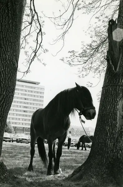 Hest bundet fast i et tre utenfor fabrikken. Tiedemanns tobakksvogner i forbindelse med Tiedemanns Tobaksfabriks 200-årsjubileum i 1978.