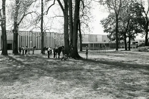 Hester bundet fast i trær utenfor fabrikken. Tiedemanns tobakksvogner i forbindelse med Tiedemanns Tobaksfabriks 200-årsjubileum i 1978.
