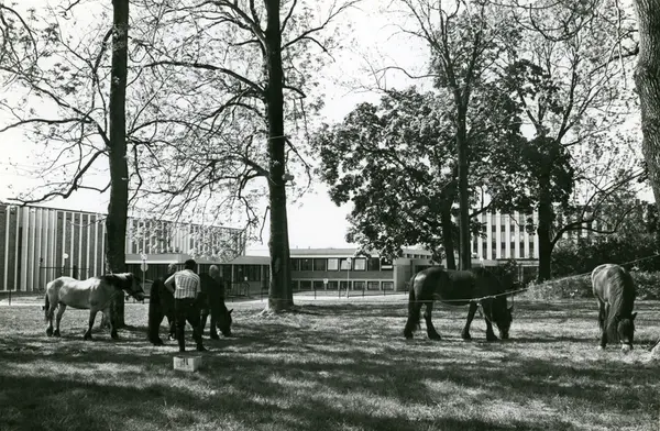 Hester bundet fast i trær utenfor fabrikken. Tiedemanns tobakksvogner i forbindelse med Tiedemanns Tobaksfabriks 200-årsjubileum i 1978.