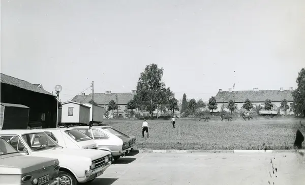 Hester på gresset utenfor fabrikken. Tiedemanns tobakksvogner i forbindelse med Tiedemanns Tobaksfabriks 200-årsjubileum i 1978.