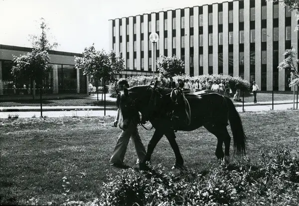 Hest utenfor fabrikken på Hovin. Tiedemanns tobakksvogner i forbindelse med Tiedemanns Tobaksfabriks 200-årsjubileum i 1978.