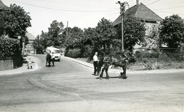 Hester utenfor fabrikken på Hovin. Tiedemanns tobakksvogner i forbindelse med Tiedemanns Tobaksfabriks 200-årsjubileum i 1978.