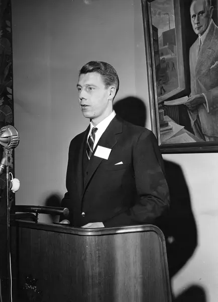 Johan H. Andresen på talerstolen. Familiedag hos Tiedemanns Tobaksfabrik i Stensberggate 1959.